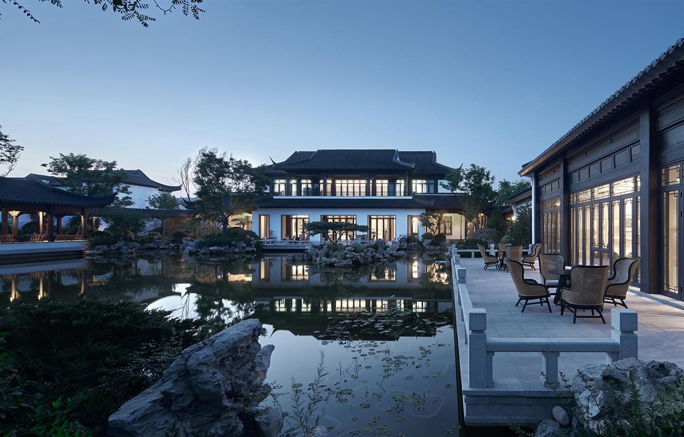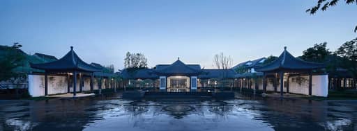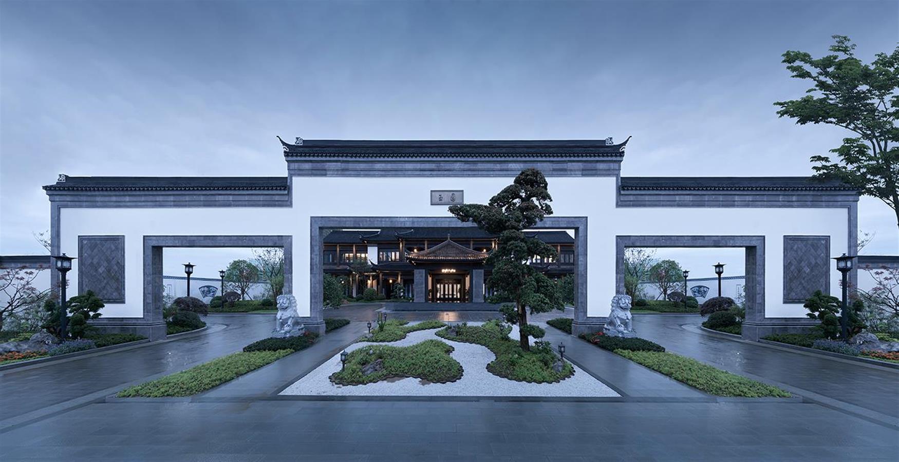 东方美学的“气韵”是缥缈且难以物化的,因此设计继承并优化了传统山院的形制,将借景、对景等传统造园手法融入项目的中式合院区,通过漏窗、月洞门、门廊等使被分隔的空间发生渗透,以形成分而不隔、穷而不尽的视觉体验。鸟瞰整个园区,如同一幅疏密相间、张弛有度的水墨丹青,缱绻地将环境纳入麾下,赋予场地轻盈的流动感与鲜活的生命力。